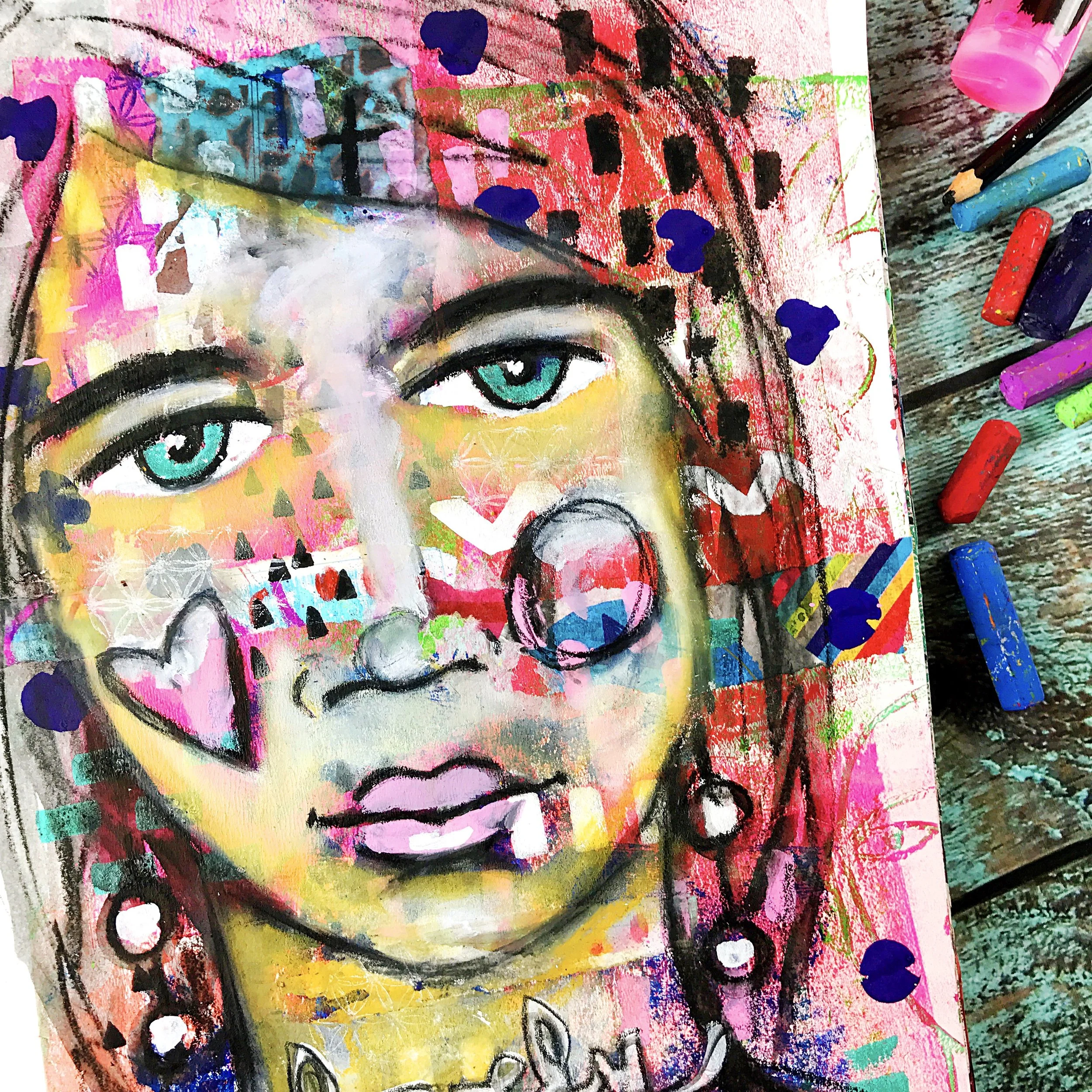 Then I'll go in with my stabilo again and redraw any parts of the face that might have been covered up with the oil paintsticks. I'll also add details to the eyes with paint pens (you can also just use acrylic paint--something opaque that will allow the eyes to really stand out). I'll darken the hair with watercolor (or just add water to the stabilo pencil and let some of it drip down the page). Collage bits are also fun at this stage.
