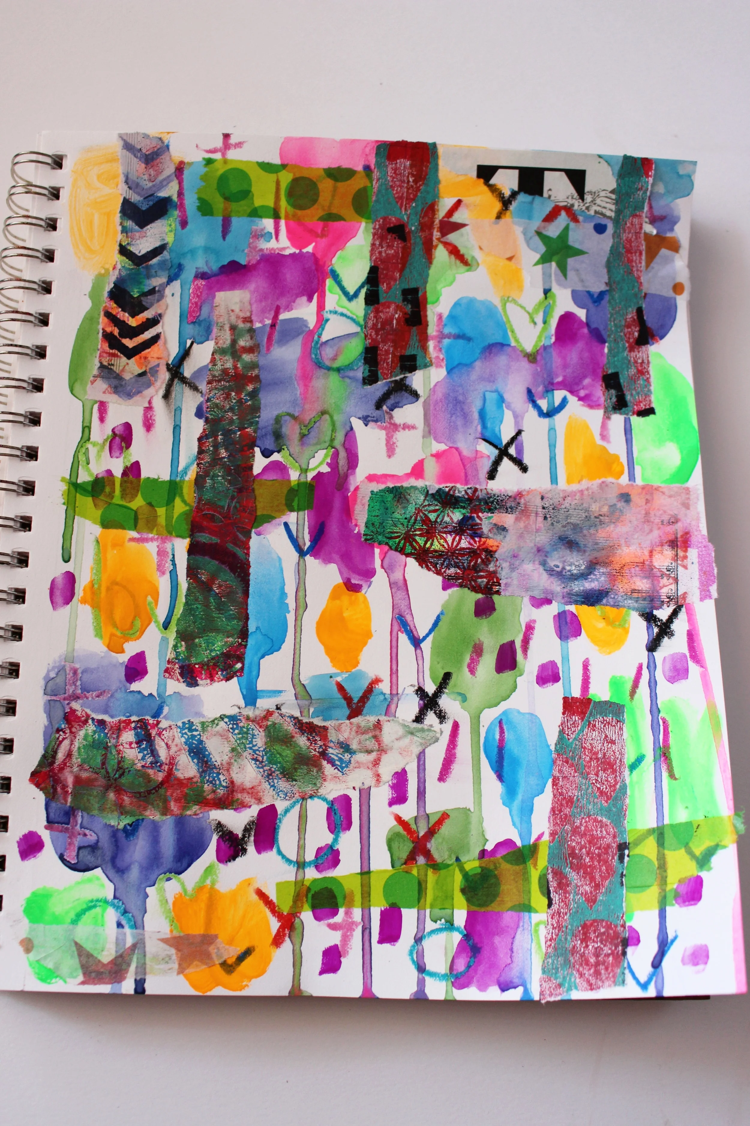 First, I start with simple marks in oil pastels and add random washes and blotches of watercolor over the top to create a colorful resist: